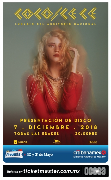 Cocó Cecé está más que lista para arribar al escenario del Lunario del Auditorio Nacional, donde presentará, de manera oficial, su nuevo disco. La cita para esta velada será el viernes 7 de diciembre. La preventa Citibanamex se realizará el 30 y 31 de mayo y la venta al público en general comenzará el 1º de junio.