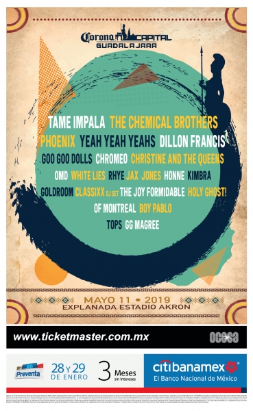 Hoy, OCESA se complace en anunciar el cartel oficial de la segunda edición de Corona Capital Guadalajara, la cual se realizará el próximo 11 de mayo de 2019 en la Explanada del Estadio Akron. Los boletos estarán disponibles en Preventa Citibanamex los días 28 y 29 de enero y en Venta General a partir del 30 de enero a través del Sistema Ticketmaster en http://www.ticketmaster.com.mx y en las taquillas del inmueble.