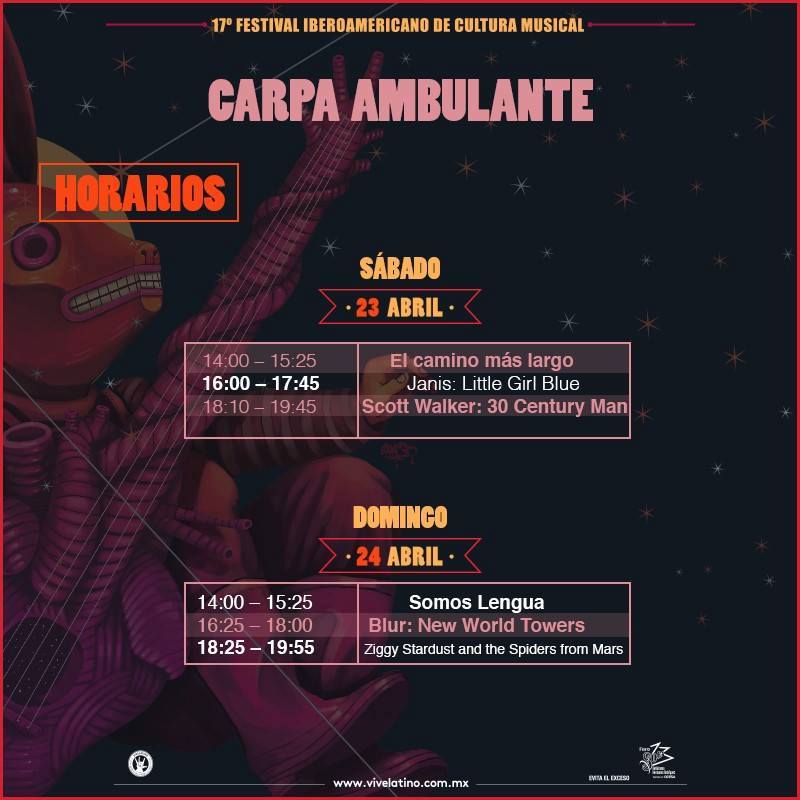 Por sexto año consecutivo, Ambulante presentará una selección de documentales en el Festival Iberoamericano de Cultura Musical Vive Latino. La Carpa Ambulante, que aumentará su capacidad en esta edición y tendrá un nuevo diseño propio de una sala de cine vintage, albergará proyecciones de forma ininterrumpida el 23 y 24 de abril. La muestra de películas reúne documentales sobre distintas corrientes musicales y artistas legendarios. Se programarán tres proyecciones cada día, que irán seguidas de pláticas con invitados especiales.